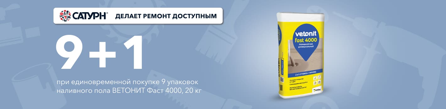 При единовременной покупке 9 упаковок наливного пола ВЕТОНИТ Фаст 4000, 20 кг, 1 аналогичный товар Вы получаете в подарок!