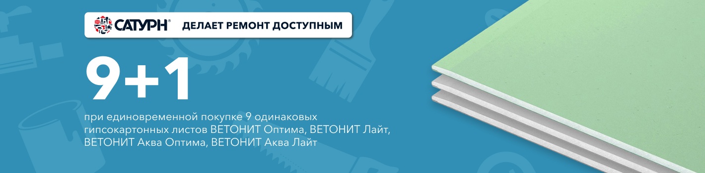 При единовременной покупке 9 одинаковых листов гипсокартона ВЕТОНИТ Оптима, ВЕТОНИТ Лайт, ВЕТОНИТ Аква Оптима, ВЕТОНИТ Аква Лайт, 1 аналогичный товар Вы получаете в подарок!
