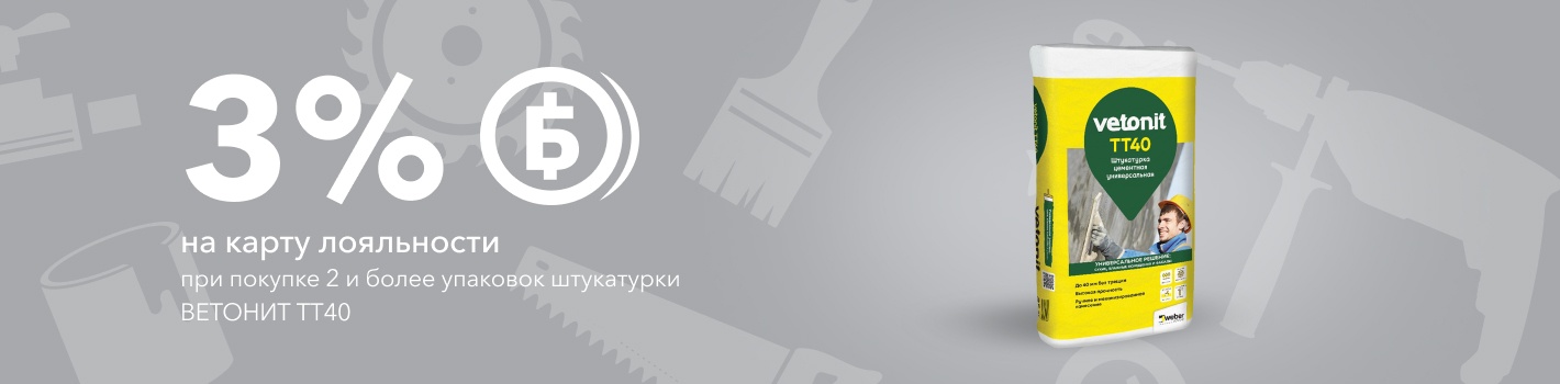 При покупке 2 и более упаковок штукатурки ВЕТОНИТ ТТ40, Вы получаете кэшбек 3% бонусными баллами на карту лояльности!