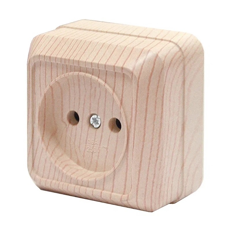 Розетка одноместная без заземления открытой установки серии ОЛИМП , 1 гнездо, светлое дерево предназначена для установки в помещениях с открытой проводкой (ремонт, складские и подсобные помещения, временные коммуникации, нежилые помещения и места, где заземление не требуется). Подходит для быстрой замены и монтажа в бытовых и коммерческих сетях переменного тока.