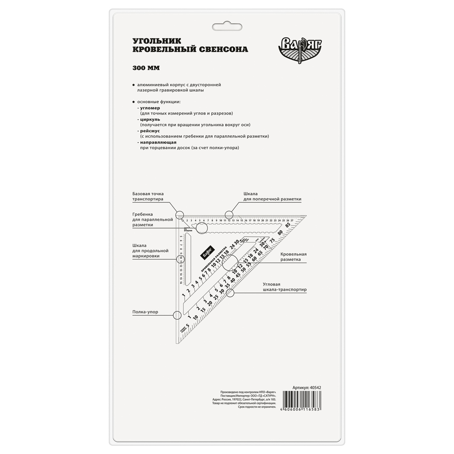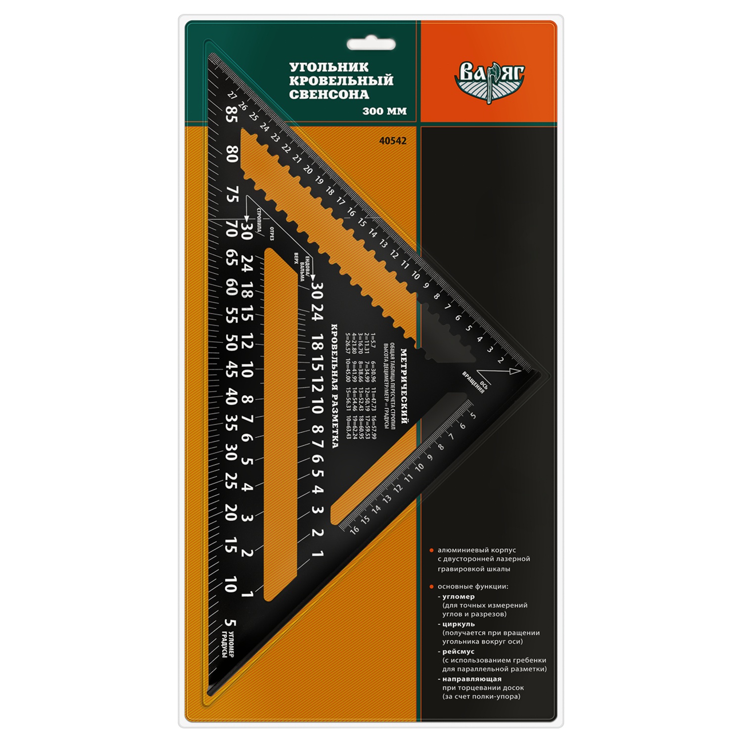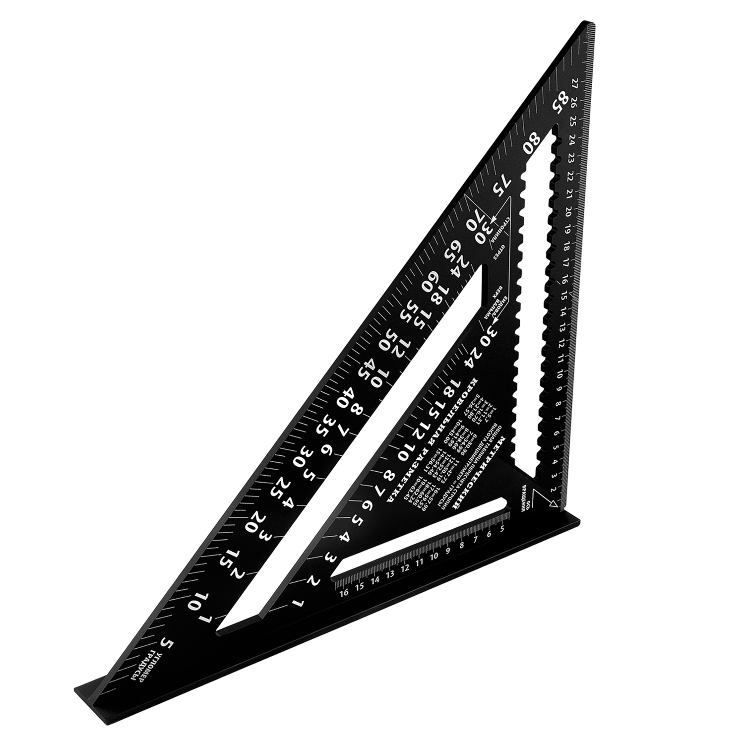 Многофункциональный измерительный инструмент для проведения кровельных и столярных работ. Алюминиевый корпус с двусторонней лазерной гравировкой шкалы.